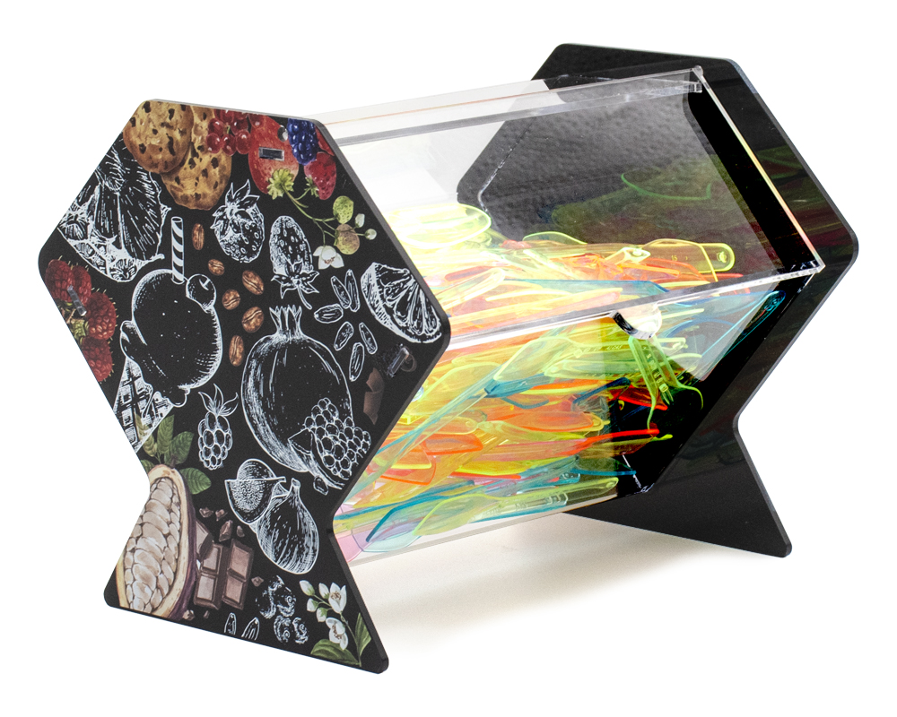 Contenitore Plexiglass per Capsule da caffè, Cucchiaini, Bustine di Zucchero Struttura in plexiglass nero satinato con stampa digitale Provvisto di sportello di chiusura anti polvere Contenitore ideale per bar, gelaterie e pasticcerie, pratico, versatile ed elegante Può essere utilizzato per cialde gelateria, capsule caffè, cucchiaini, bustine di zucchero, caramelle....... Certificato al contatto con alimenti (Direttiva Europea 2002/72/EC) Art.: 2300 Nero Dimensioni: cm L12x P12 x H12 Colori: Nero